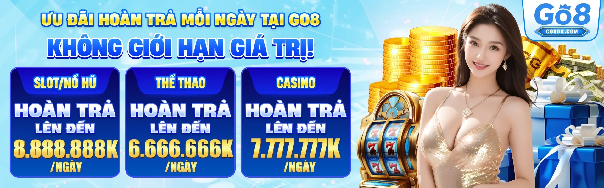 Bên cạnh thể thao và casino, Go8 còn phát triển các trò chơi slot với nhiều chủ đề phong phú, mang lại sự mới mẻ và hấp dẫn cho người chơi. Các trò chơi này thường có tỷ lệ thắng thưởng cao và nhiều tính năng đặc biệt giúp tăng trải nghiệm.